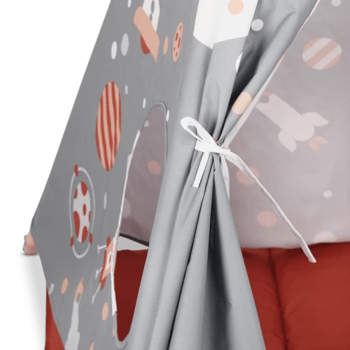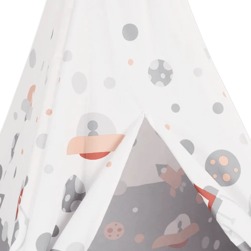La tente indienne Cosmo Tipi pour enfants est l’endroit idéal pour vivre de grandes aventures sans quitter la maison. Un espace parfait pour les garçons et les filles, où ils peuvent passer des heures à jouer, imaginer et se détendre. Qui n’a jamais rêvé d’être dans un vaisseau spatial ? Ce tipi pliable pour enfants possède une fenêtre latérale pour pouvoir observer l’extérieur pendant que nous sommes à l’intérieur et ajouter plus de réalisme à ce jeu Montessori éducatif, pédagogique, imaginatif et symbolique. De plus, il comprend un protecteur rembourré qui offre un plus grand confort et nous isole du sol pour que nous puissions jouer entièrement protégés. Grâce à son tissu polyester imperméable, il est parfait pour rêver et créer des histoires passionnantes aussi bien à l’intérieur qu’à l’extérieur, placez-le sur la terrasse et/ou dans le jardin de votre maison ! Son design unique et unisexe, inspiré de l’univers. La structure de ce tipi pour enfants est faite de bois naturel pour être respectueuse de l’environnement. Il a été fabriqué sans l’utilisation de substances nocives, de sorte qu’il est 100 % non toxique et totalement sûr pour les enfants. Qu’apprenons-nous ? Motricité globale : stimuler cette capacité est très important pour que les enfants développent le contrôle de leurs mouvements corporels. Elle contribue également à intégrer l’enfant dans son environnement, par l’exploration et la découverte. L’imagination : La cabane est un espace de jeu symbolique qui permet aux enfants de transformer et de créer d’autres mondes, où créer et imaginer. Un endroit où l’on peut se retrouver et trouver ses propres règles. Créativité : C’est un jouet très bénéfique car il stimule leur créativité, en inventant des situations et des solutions différentes, en encourageant le langage et la socialisation. La stimulation sensorielle : elle est fondamentale pendant les premières années de la vie.