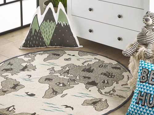 Ce tapis de couleur taupe Ă motif carte du monde n’est pas seulement un accessoire, il peut Ă©galement aider les jeunes explorateurs Ă dĂ©couvrir le monde. Ce tapis en coton est un excellent choix comme descente de lit ou juste comme dĂ©coration pour toutes les chambres d’enfants ou toutes autres piĂšces necessitant de la dĂ©co ludique.