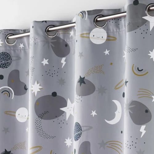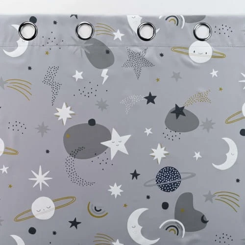 Ambiance astrale avec cerideau occultant de 140 x 260 cm qui décorera à merveille la chambre. de votre enfant.. Celui-ci est imprimé de lunes, d’étoiles et de planètes sur un fond uni et coloré. De plus, vous n’allez plus être dérangé par les rayons du soleil, pendant la sieste des petits car il estoccultant ce qui plongera. votre pièce dans l’obscurité.. 2 coloris qui s’intégreront dans la chambre de votre enfant pour une déco de fille ou de garçon. Le verso est uni en coloris blanc avec des oeillets ronds argentés. A vous de créer une ambiance apaisante et originale avec ce magnifique rideau occultant. Lavable en machine à 30°C. Vendu à l’unité. Prêt à poser. Vous retrouverez d’autres articles assortis sur notre site pour parfaire votre déco.