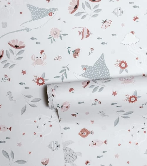 Créez un joli marin fleuri. Avec ce papier peint la chambre se transformera en un aquarium géant avec des raies manta, des tortues d’eau, de jolis poissons, des petits crabes, des méduses, des coraux, de jolies fleurs et des hippocampes. Le résultat est fantastique!