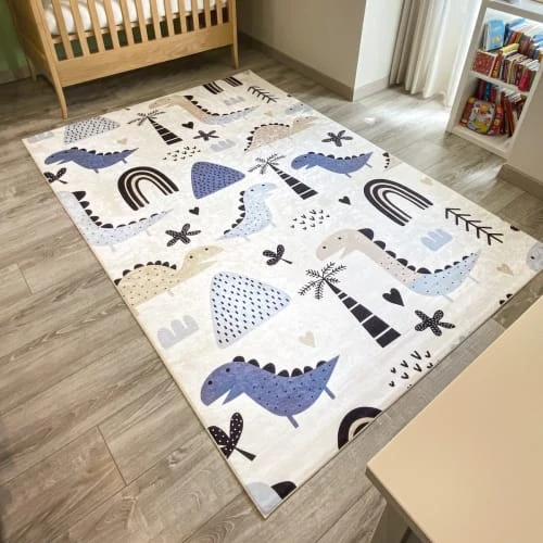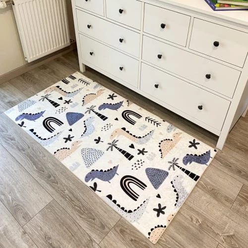Ce tapis pour enfants dinosaures dispose d’un support antidérapant. Son design coloré ne manquera pas de plaire à votre enfant ! Le design coloré présente des grands dinosaures bleu. Vous pouvez placer ce tapis dinosaure enfant n’importe où dans votre maison et il sera superbe ! Il est parfait pour les enfants de tous âges et constitue une excellente idée de cadeau pour les anniversaires ou les fêtes.